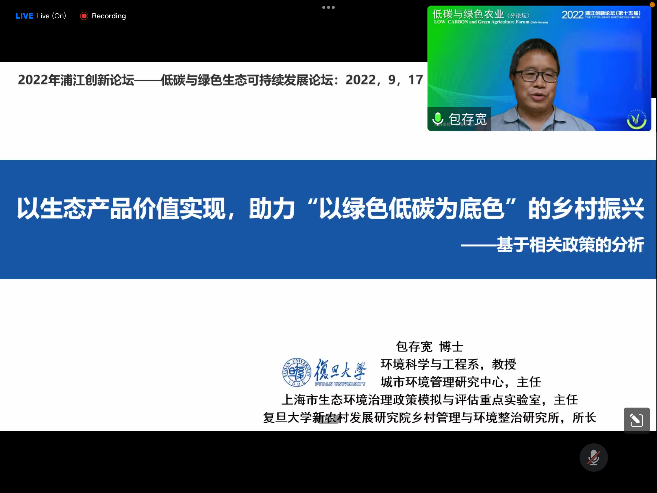 Fudan university professor of environmental science and engineering BAO Cunkuan made a titled "with ecological product value realization, the power of" a green low carbon base country revitalization - based on the analysis of the related policy "of the report, based on the" "a green low carbon base country revitalization of big background, reviews the concept of ecological product value realization and policy process, And put forward policy suggestions to promote rural revitalization with "green and low carbon as the background color".