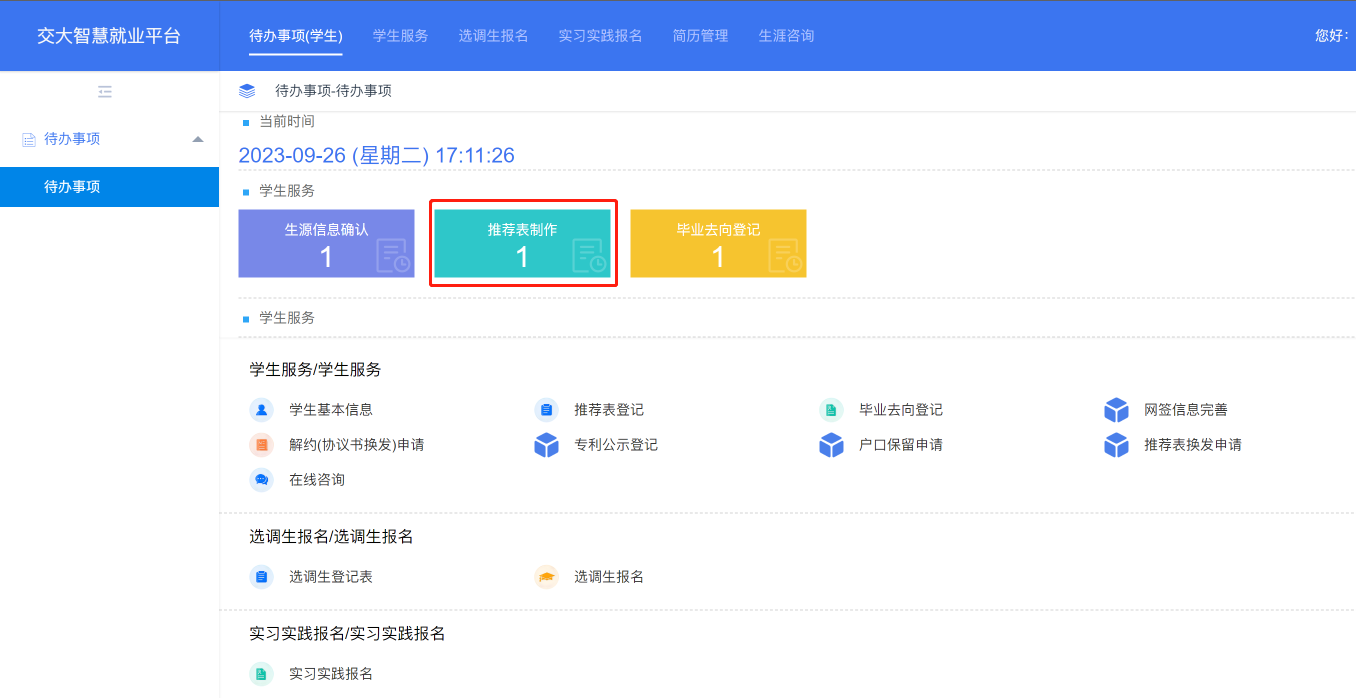 制作流程:在校就业网http://www.job.sjtu.edu.cn首页,jAccount登录,点击【推荐表制作】,进入毕业生推荐表编辑页面。【需要提前完善员工基本信息】
