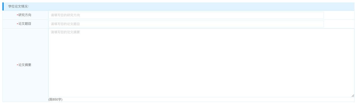 4.“学位论文情况”:请详细填写,如果论文题目还没定,也可以根据论文方向填写。至少3行。