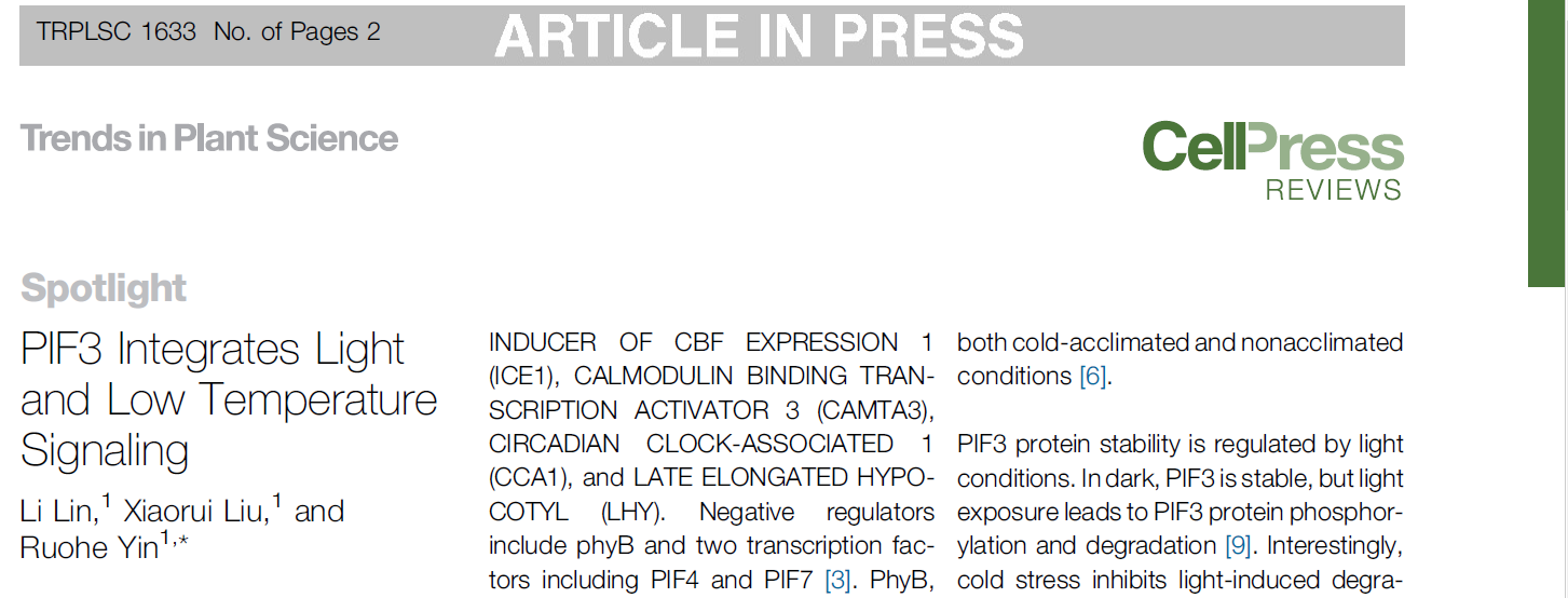 近日,伟德国际1946植物光控发育团队在Cell Press旗下的专业综述杂志Trends in Plant Science在线发表了一篇题为“PIF3 Integrates Light and Low Temperature Signaling”的热点推荐文章(Spotlight)。