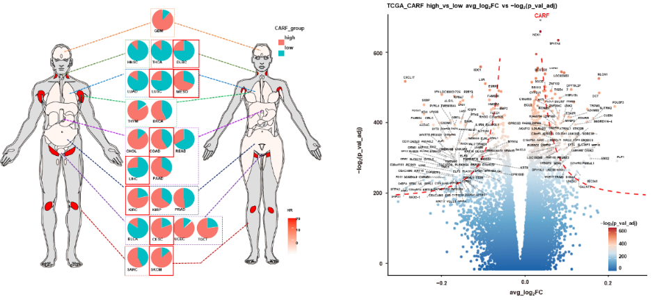 I型酪蛋白激酶CK1(Casein Kinase 1)是一类高度保守的丝氨酸/苏氨酸蛋白激酶,在真核生物中广泛存在,通过磷酸化特定底物蛋白参与多种关键生物学过程和细胞信号网络的调控,包括细胞周期调控、DNA损伤修复、昼夜节律、Wnt/β-catenin、Hippo和p53信号通路等。CK1家族成员在肿瘤的发生发展中发挥重要调控作用,并且因其亚型、细胞环境和底物选择表现出抑癌和促癌双重功能,表明了CK1在肿瘤调控中的特异性和精准靶向的重要性。该团队的前期研究表明CK1可以磷酸化植物细胞周期抑制蛋白KRP6(Kip-Related Protein 6)进而调控植物的细胞分裂。进一步的分析发现哺乳动物CARF与拟南芥KRP6同源且具有保守的CK1磷酸化位点。对多种公共数据库进行的泛癌分析发现,CARF作为与p53相互作用的重要细胞周期调控因子,与B细胞淋巴瘤发生、患者生存及利妥昔单抗(Rituximab)治疗密切相关(图1)。