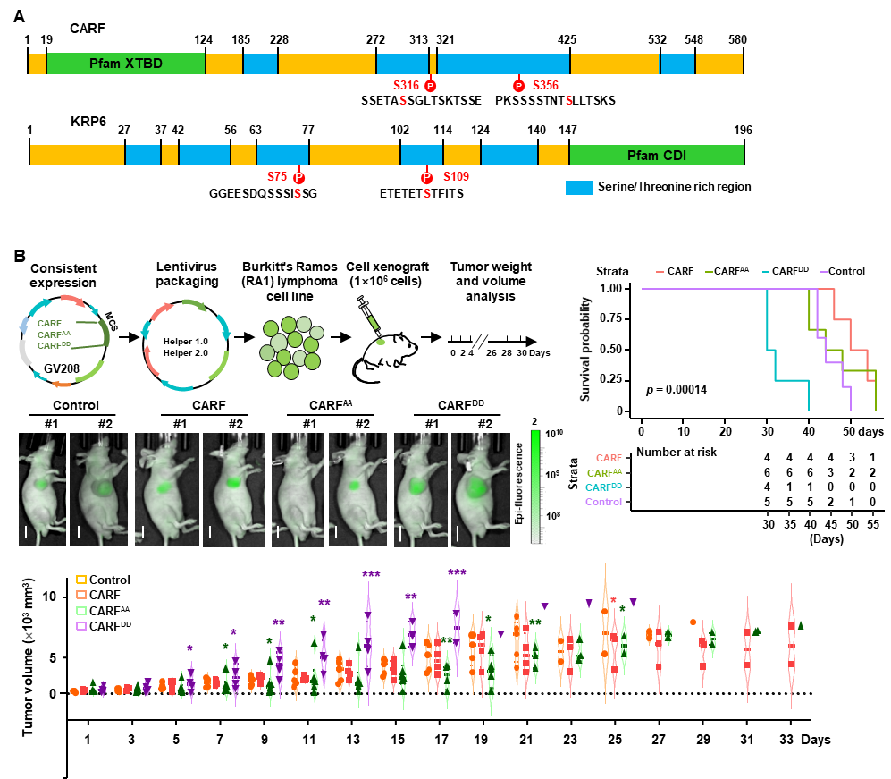 图2. CARF与KRP6 具有保守的磷酸化位点(A),非磷酸化状态的CARF抑制淋巴瘤细胞的增殖(B)