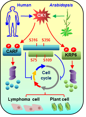 图3.靶向磷酸化修饰的哺乳动物CARF和植物KRP6抑制细胞增殖