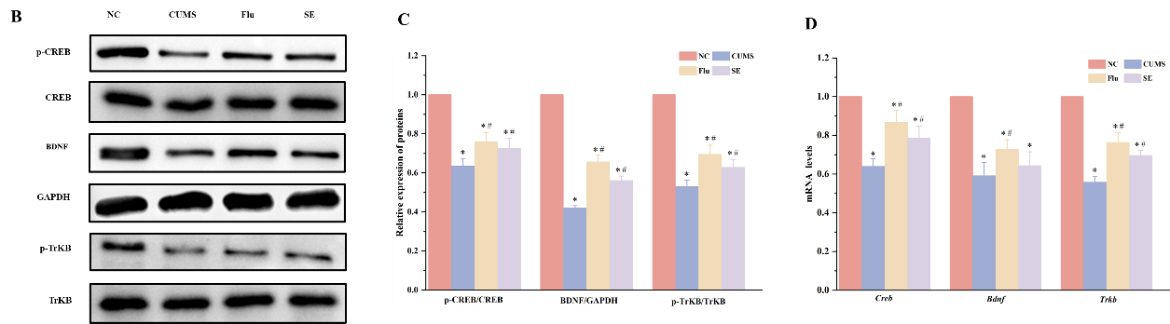 机制研究表明,藏红花提取物能够抑制CUMS诱导的小胶质细胞激活,从而抑制NF-κB信号通路,降低炎症因子水平(图3)。此外,藏红花干预还缓解了神经炎症对神经发生的损害,并通过激活CREB/BDNF/TrkB通路部分恢复了神经可塑性(图4)。
