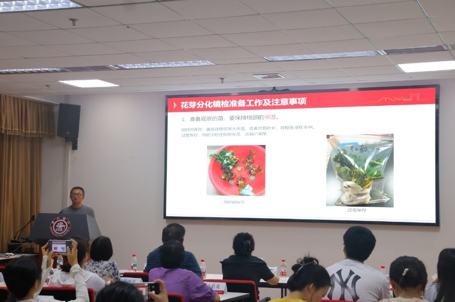 随后,伟德国际1946许鹏博副研究员作题为《草莓花芽分化:理论与镜检实操 —— 助您精准定植提收益》的专题报告。他从花芽分化的生理机制入手,系统讲解了影响花芽分化的环境与栽培因素,并结合实际生产案例,指出花芽分化阶段对定植时间决策的关键影响。通过丰富的显微图像和研究成果展示,许鹏博副研究员详细解析了各分化时期的形态特征及常见误判情况,提升了学员的理论认知与实操预判能力。