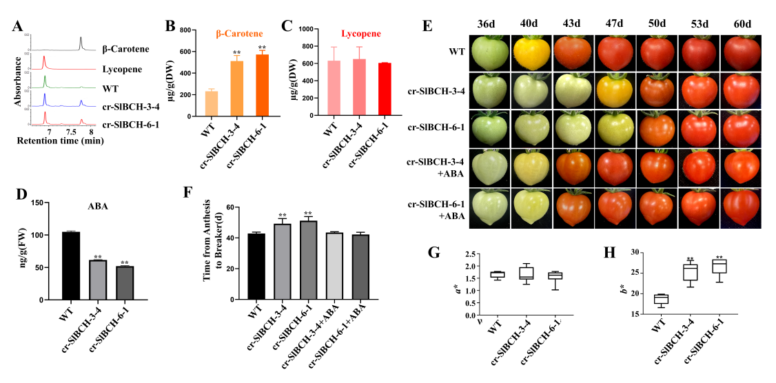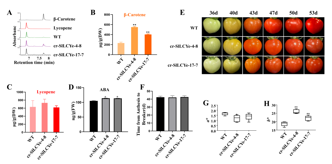 该团队采用CRISPR/Cas9基因编辑技术,针对番茄中与β-胡萝卜素代谢相关的两个关键基因——SlLCYeSlBCH,成功构建敲除突变体(cr-SlLCYe、cr-SlBCH)。其中,敲除SlLCYe可阻断番茄红素向α-胡萝卜素转化,将代谢流导向β-胡萝卜素合成;敲除SlBCH则能减少β-胡萝卜素降解,以提高β-胡萝卜素的积累。