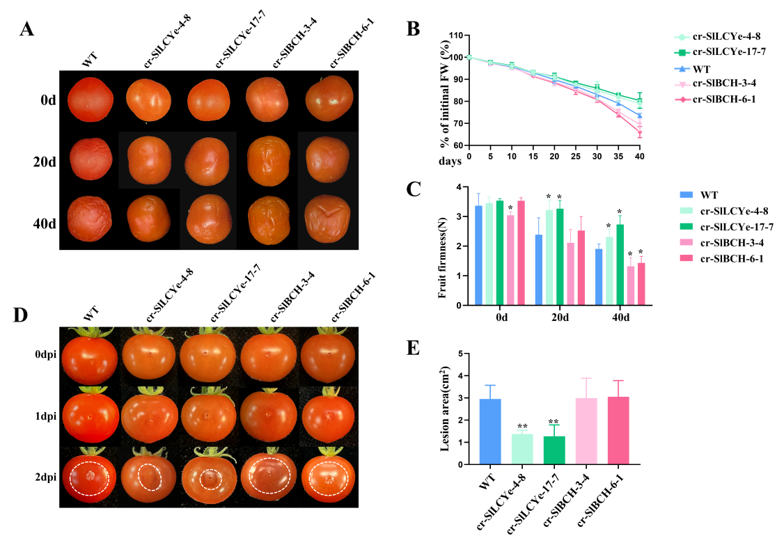 采后特性:cr-SlLCYe突变体还表现出货架期显著延长,对灰霉菌(番茄采后主要致病菌)抗性增强等采后优良特性。